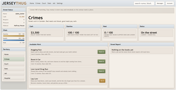 Jersey Thug is a browser-based crime / strategy game where you start small, work the streets, build your name, and deal with the consequences when things go bad.
